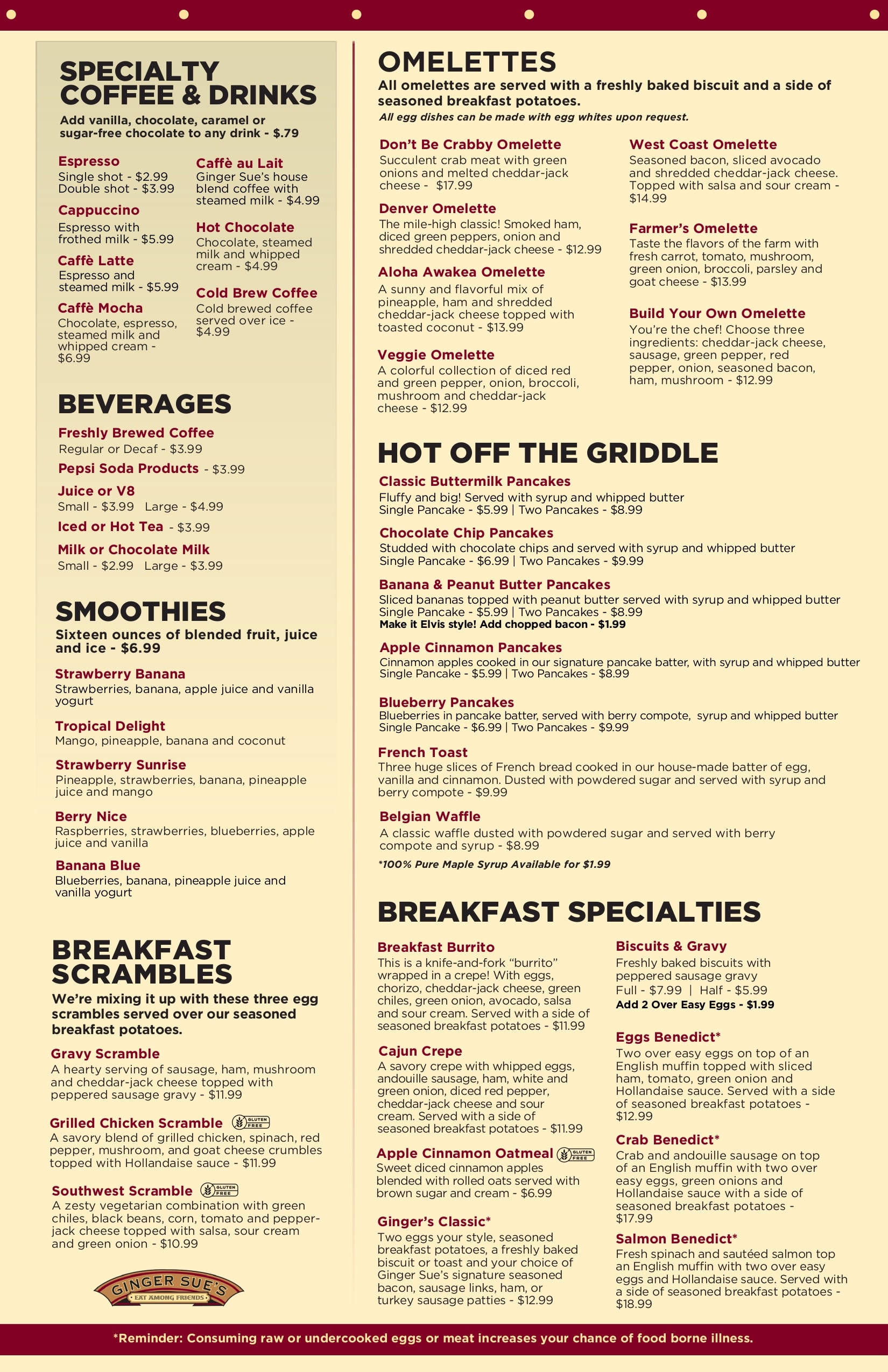 Classic and contemporary breakfast, brunch and lunch. With fresh food, warm service and hot coffee. There’s always a seat at Ginger Sue’s.