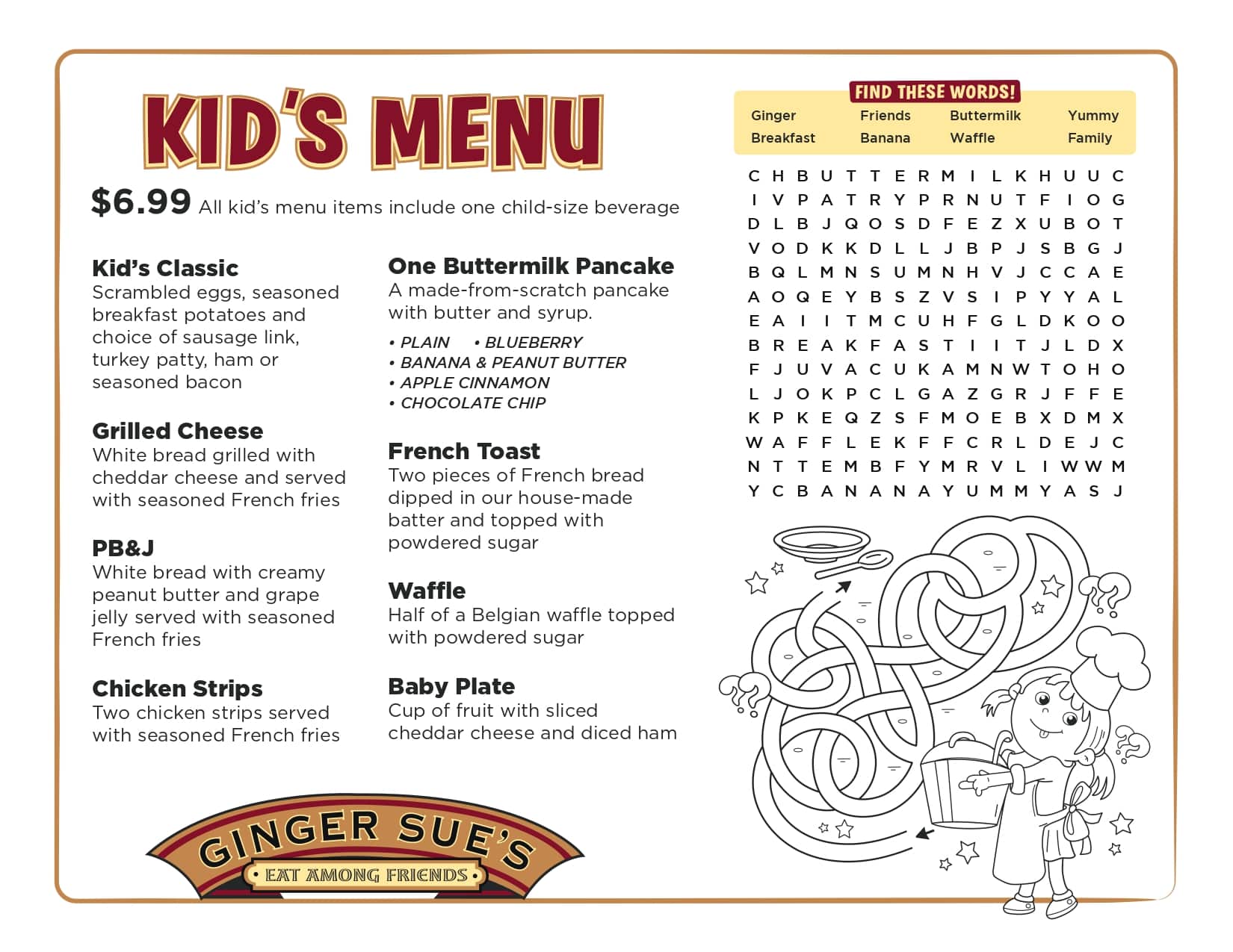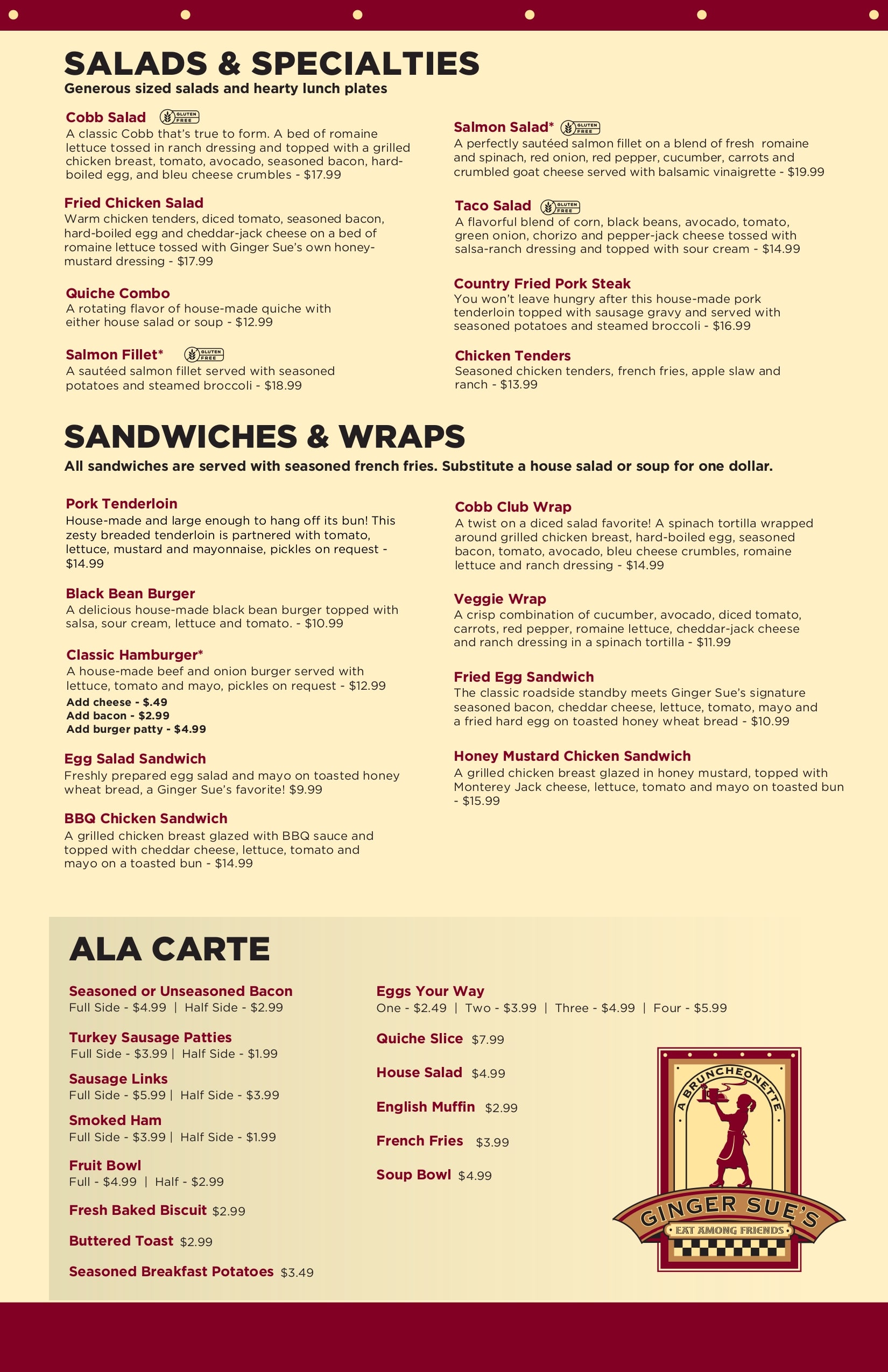 At Ginger Sue’s we focus on fresh, unique tastes in a quaint, casual atmosphere. Serving both breakfast and lunch from 6:30am-2:30pm, we create an experience you will want to share. Join us and Eat Among Friends.